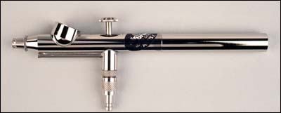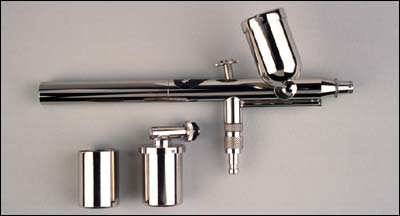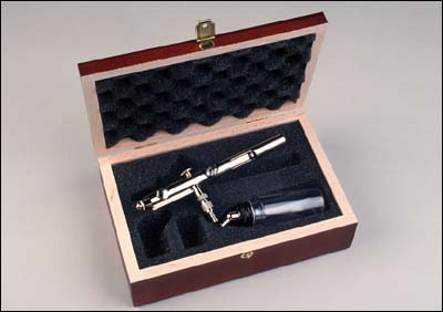 capabilities make pain- ting materials such as wood, plastics and metal, as well as T- shirts, silks and a host of other items, mere child's play. Pro- duce a perfect line simply by pre-adjusting the paint flow. It is user-friendly, too, due to simplified function and ergonomics. Constructed entirely of metal, the airbrush pistol is tough and resistant. Its innovative needle and suction cap leave no paint residue, while its Teflon needle-joint makes for dependability and durability. As accessories you get a variety of paint cups in diverse designs. And on the top of all this, the combination of lever and needle adjustments will give you the widest range of applications you can think of. |